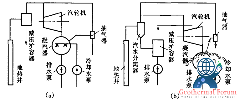 閃蒸地?zé)岚l(fā)電系統(tǒng)是一種比較適用于中低溫地?zé)崴?/a>發(fā)電的系統(tǒng)(又稱“減壓擴容法”),圖1所示為這種系統(tǒng)的流程圖。來自地?zé)峋?/a>的熱水首先進(jìn)入閃蒸器(減壓擴容器)(圖1-a),容器內(nèi)維持著比熱水壓力低的壓力,因而部分熱水得以閃蒸并將產(chǎn)生的蒸氣送往汽輪機膨脹做功發(fā)電。如地?zé)峋?/a>口流體是濕蒸氣(圖1-b),則先進(jìn)入汽水分離器,分離出的蒸氣送往汽輪機做功發(fā)電,分離剩余的水再進(jìn)入閃蒸器,閃蒸后得到的閃蒸蒸氣也送往汽輪機做功。