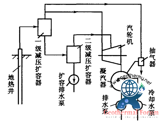 圖2是多級閃蒸(多級減壓擴容)蒸氣循環(huán)的流程圖。從井口流出的熱水先進(jìn)入第一級減壓擴容器,產(chǎn)生的蒸氣進(jìn)入汽輪機的高壓部分,而從第一級閃蒸器底部出來的閃蒸后的剩余熱水再進(jìn)入第二級閃蒸器(擴容器),產(chǎn)生二次閃蒸蒸氣,并通往汽輪機低壓部分做功。若井口出來的是濕蒸氣,則直接進(jìn)入汽水分離器,蒸氣分離出來后去高壓部分做功,熱水再進(jìn)入第二級閃蒸器(減壓擴容器),所以實際上是用一個汽水分離器代替了第一級閃蒸器,如(圖1-b)所示。第二級閃蒸器分離出來的熱水壓力若高于大氣壓力,則熱水可以自行排出;不然,就要用排水泵抽出。閃蒸器的級數(shù)增加,單位質(zhì)量工質(zhì)輸出功也增加,即地?zé)崴?/a>中的能量愈能得到充分利用。當(dāng)級數(shù)無限多時,理論上可以得到最大的輸出功,增益達(dá)到極限。但是,級數(shù)增加將使設(shè)備投資增加,系統(tǒng)變得復(fù)雜,所以實際采用的閃蒸級數(shù)一般不超過四級。地?zé)崃黧w溫度高可以級數(shù)多些,熱水溫度較低時就不宜采用二級以上的閃蒸系統(tǒng)。