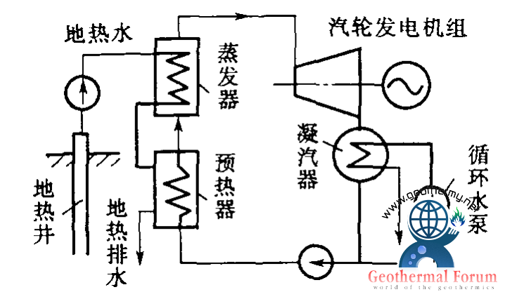 雙循環(huán)地?zé)岚l(fā)電系統(tǒng)是利用地下熱水來(lái)加熱某種低沸點(diǎn)工質(zhì),使其進(jìn)入汽輪機(jī)工作的地?zé)岚l(fā)電系統(tǒng),又稱中間介質(zhì)法或低沸點(diǎn)工質(zhì)循環(huán)。它是為克服閃蒸地?zé)岚l(fā)電系統(tǒng)的缺點(diǎn)而出現(xiàn)的一種循環(huán)系統(tǒng)。地下熱水用深井泵抽到地面進(jìn)入電站內(nèi)的蒸發(fā)器,加熱某一種低沸點(diǎn)介質(zhì)(如氟里昂11、氯乙烷等),使之變?yōu)榈头悬c(diǎn)介質(zhì)蒸氣,然后通入汽輪機(jī)做功發(fā)電,汽輪機(jī)排出的乏汽經(jīng)凝汽器冷凝成液體,用工質(zhì)泵再打回蒸發(fā)器重新加熱,循環(huán)使用。為充分利用地?zé)崴?/a>的余熱,讓從蒸發(fā)器排出的地?zé)崴?/a>經(jīng)過(guò)一個(gè)預(yù)熱器先預(yù)熱來(lái)自凝汽器的低沸點(diǎn)工質(zhì)液體,使其溫度上升至接近蒸發(fā)器內(nèi)的工質(zhì)飽和溫度,再進(jìn)入蒸發(fā)器。為了保證從地?zé)峋?/a>來(lái)的地?zé)?/a>水在輸送過(guò)程中不閃蒸成蒸氣和不使溶解氣體從水中逸出,在管路中的熱水始終保持超過(guò)其溫度對(duì)應(yīng)的飽和壓力。