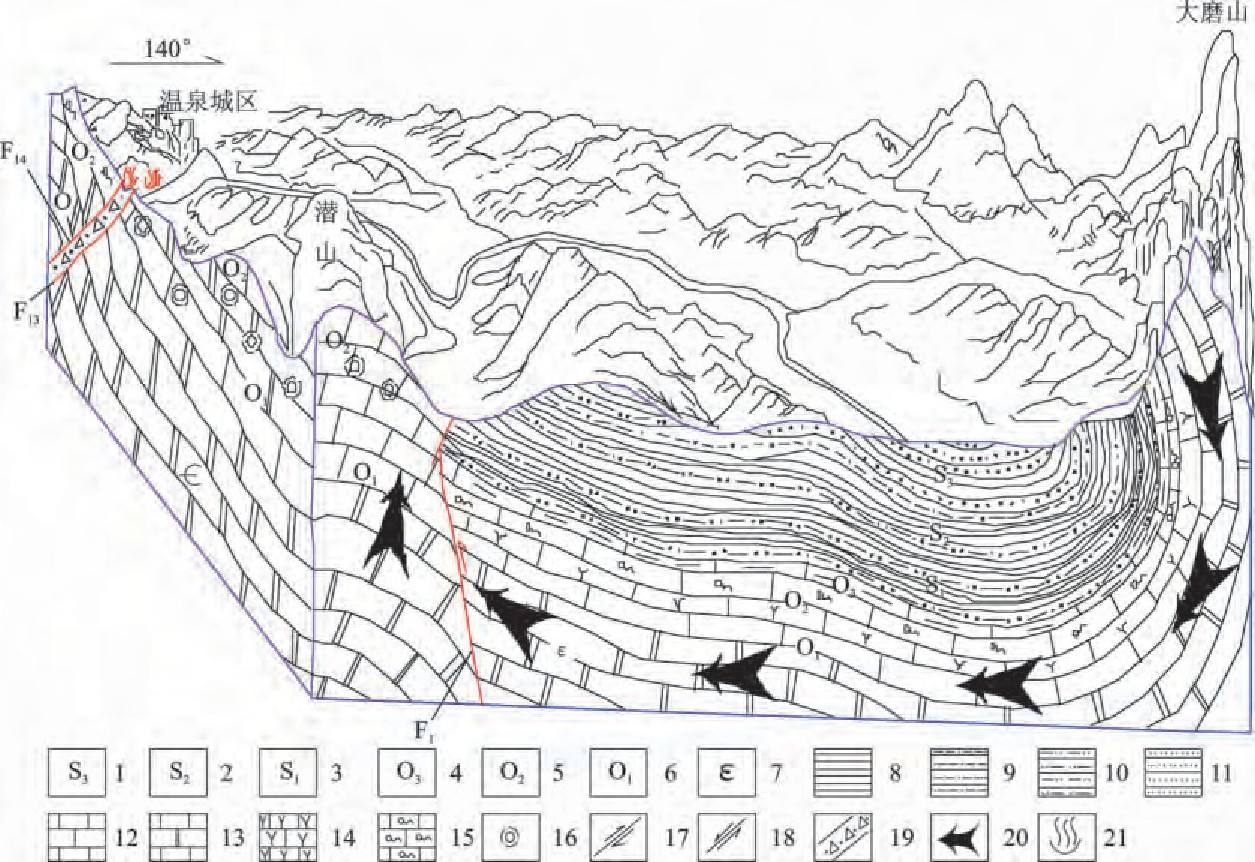 咸寧地質構造位置處于揚子準地臺梁子湖坳陷與咸寧臺褶束的交接部位,從屬于大幕山復式背斜北翼的次級構造—高橋向斜、孫鑒鋪倒轉背斜、賈家山倒轉向斜的西延部分,由一系列的緊密褶皺組成區(qū)內的基本構造骨架。新華夏晚期構造體系在潛山一帶表現強烈,其中大義山式斷裂有明顯的反映。這些不同的構造體系互相干擾、復合,不僅控制了區(qū)內的巖性組合、地貌、巖溶發(fā)育,而且也嚴格控制了地下水的分布及其補給、運移和排泄。潛山背斜是地熱田的主要構造骨架,其特點是呈梳狀,且向南東倒轉,區(qū)內溫泉斷裂規(guī)模最大,且是經過多次構造變動的復合性斷裂,先期為縱張斷裂且以垂直運動為主,后期表現為逆向復合,并受逆時針的應力作用而顯壓扭性特征,是深切割斷裂,也是控制區(qū)內地熱流體分布的主要斷裂。
