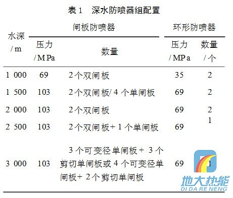 水下防噴器是海洋石油鉆采過程中用于防止井噴發(fā)生的專用設(shè)備,上部連接隔水管裝置,下部連接海底井口裝置。深水防噴器組通常有5個閘板和2個萬能防噴器組成,第5個閘板即底閘板可以剪斷套管,套管剪切閘板位于盲板的下部,以便在剪斷套管后可以關(guān)井,通常在套管可能遇卡或者鉆井裝置需要應(yīng)急脫離時會用到。2個萬能防噴器是冗余設(shè)計(jì)的需要,上部萬能防噴器作為井控的主要手段。根據(jù)水深的不同,深水防噴器組通常有不同的配置。表1是在總結(jié)Transocean公司所有不同水深典型鉆井船防噴器組配置情況得出的,可以作為深水鉆井防噴器組配置的參考。 對于浮式鉆井裝置(半潛式平臺或鉆井船),選用防噴器系統(tǒng)的通徑為?476.3mm(工作水深<600m)或?425.5mm(工作水深>600m),選用封井壓力為69、103、138MPa時,視工作水深、海底至目的層深度和是否為特殊高壓的油氣層而定。為了適應(yīng)欠平衡鉆井的需要,井口防噴器組合要配置高壓旋轉(zhuǎn)防噴器,即隨鉆壓力控制系統(tǒng)PCWD(Pres2sureControlWhileDrilling)。