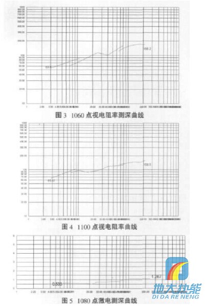 (2)在100線1060、1100點(diǎn)上進(jìn)行電阻率測(cè)深, 從二個(gè)點(diǎn)的曲線形態(tài)來看,曲線形態(tài)相似且地層分層明顯;70~200m層位穩(wěn)定,基本為砂巖(見圖3~4)。