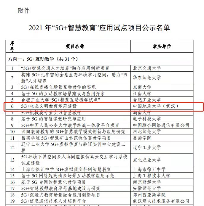 地大新聞網(wǎng)訊:近日,工業(yè)和信息化部、教育部聯(lián)合公示2021年“5G+智慧教育”應(yīng)用試點項目入圍名單,我校牽頭申報的“5G+生態(tài)文明教育示范建設(shè)”項目成功入選。