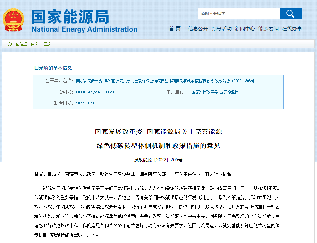 國家發(fā)展改革委、國家能源局近日公布《關(guān)于完善能源綠色低碳轉(zhuǎn)型體制機(jī)制和政策措施的意見》(以下簡稱《意見》),明確到2030年,基本建立完整的能源綠色低碳發(fā)展基本制度和政策體系,形成非化石能源既基本滿足能源需求增量又規(guī)?;娲?a href="http://m.shanjz.cn/t/化石能源.html" >化石能源存量、能源安全保障能力得到全面增強(qiáng)的能源生產(chǎn)消費(fèi)格局。