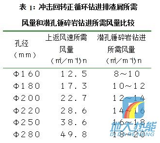 基巖水井通常口徑為Φ160~Φ280mm之間,該口徑硬巖的鉆進(jìn)效率低,成本高,施工周期長(zhǎng),成為鉆探界亟待解決的難題。20世紀(jì)70年代開(kāi)始,我國(guó)已引進(jìn)潛孔錘技術(shù)應(yīng)用于水井鉆鑿,鉆進(jìn)效率數(shù)倍提高,展示了潛孔錘鉆進(jìn)的良好前景。但水井工程,孔深大,背壓高,配套使用的空壓機(jī)不但風(fēng)量要求大,風(fēng)太也高,使鉆進(jìn)成本大幅度增高。主要矛盾是滿足排渣屑上返風(fēng)速的要求時(shí),供風(fēng)量巨大,遠(yuǎn)超過(guò)了潛孔錘本身工作的需求。計(jì)算不同孔徑條件下滿足上返風(fēng)速15m/s供風(fēng)量的需求,見(jiàn)表1(Φ89鉆桿為例)。表1數(shù)據(jù)表明,孔徑越大,為滿足排渣屑要求而消耗的能量越大,經(jīng)濟(jì)性越差。若實(shí)施反循環(huán)鉆井技術(shù)工藝,則排渣屑所需風(fēng)量大大減小,如表2所示。
